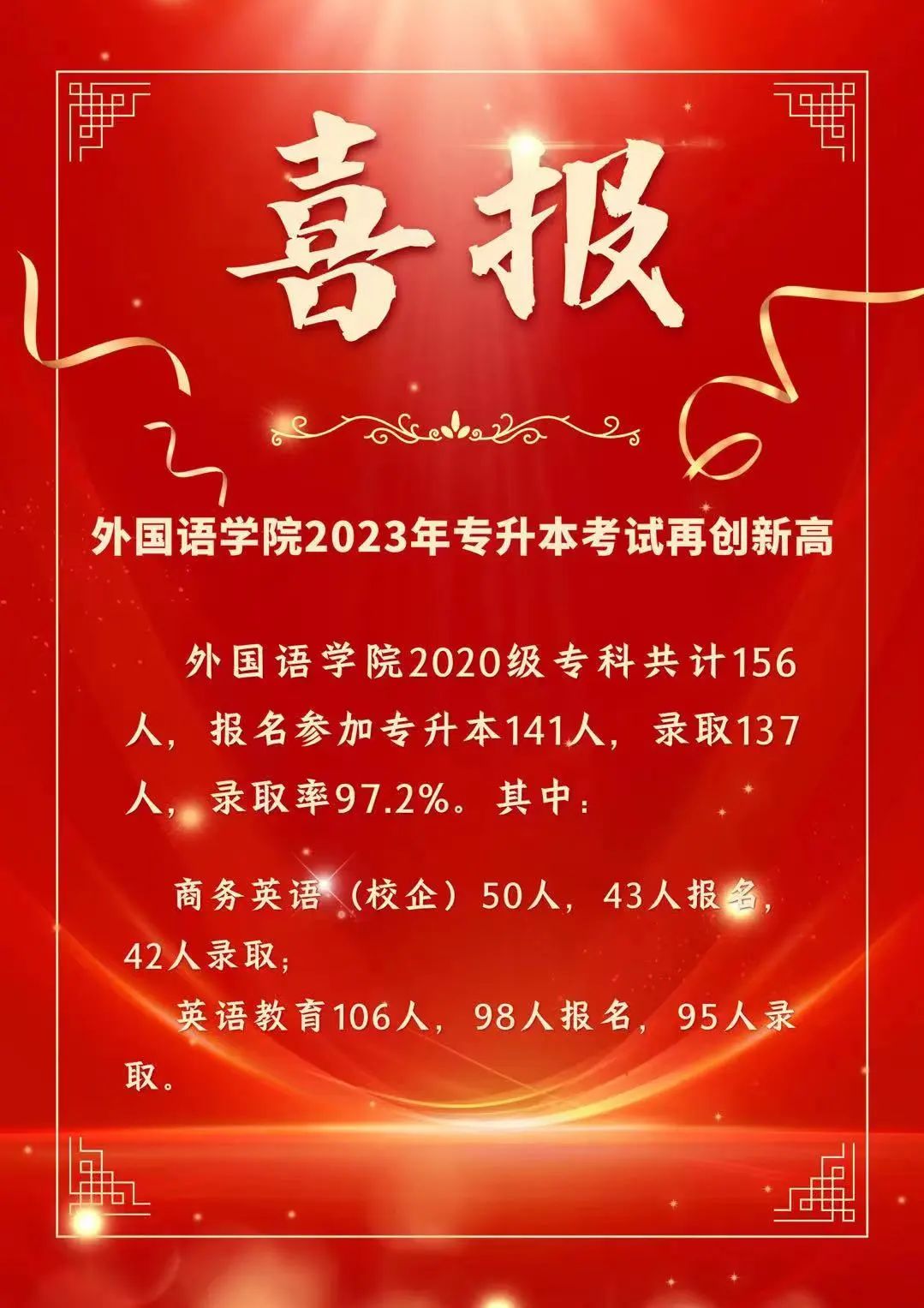 山东省2023年普通高等教育专升本录取工作近日落下帷幕,伟德国际victor19462023年专升本录取再创新高。伟德国际victor19462020级专科共计156人,有141人参加专升本考试,137人被录取,升本率达97.2%。其中,2020级英语教育专业有98人报考,录取95人,升本率96.94%;2020级商务英语(校企)专业有43人报考,录取42人,升本率达97.67%。