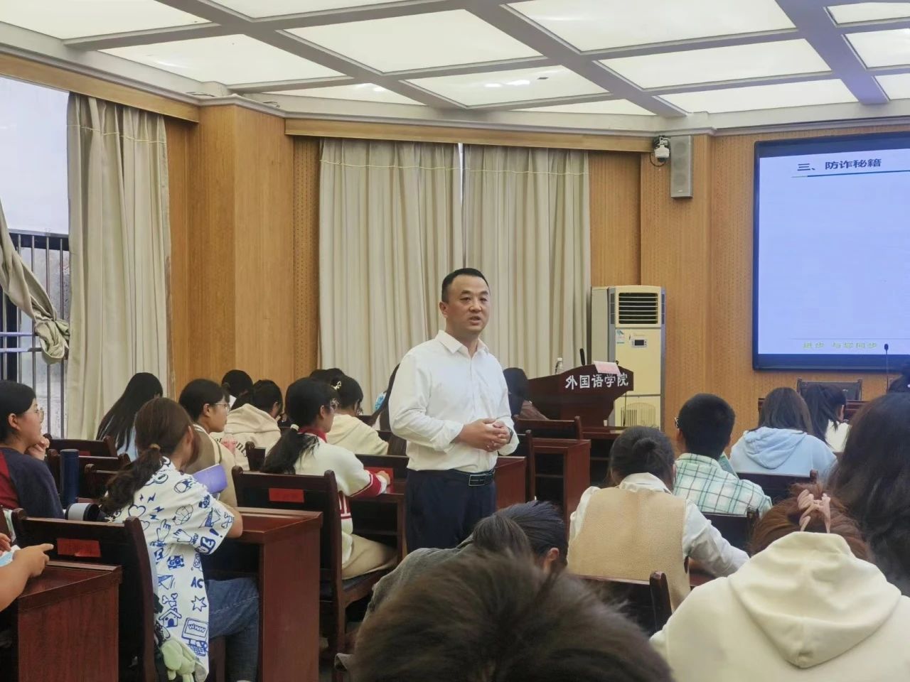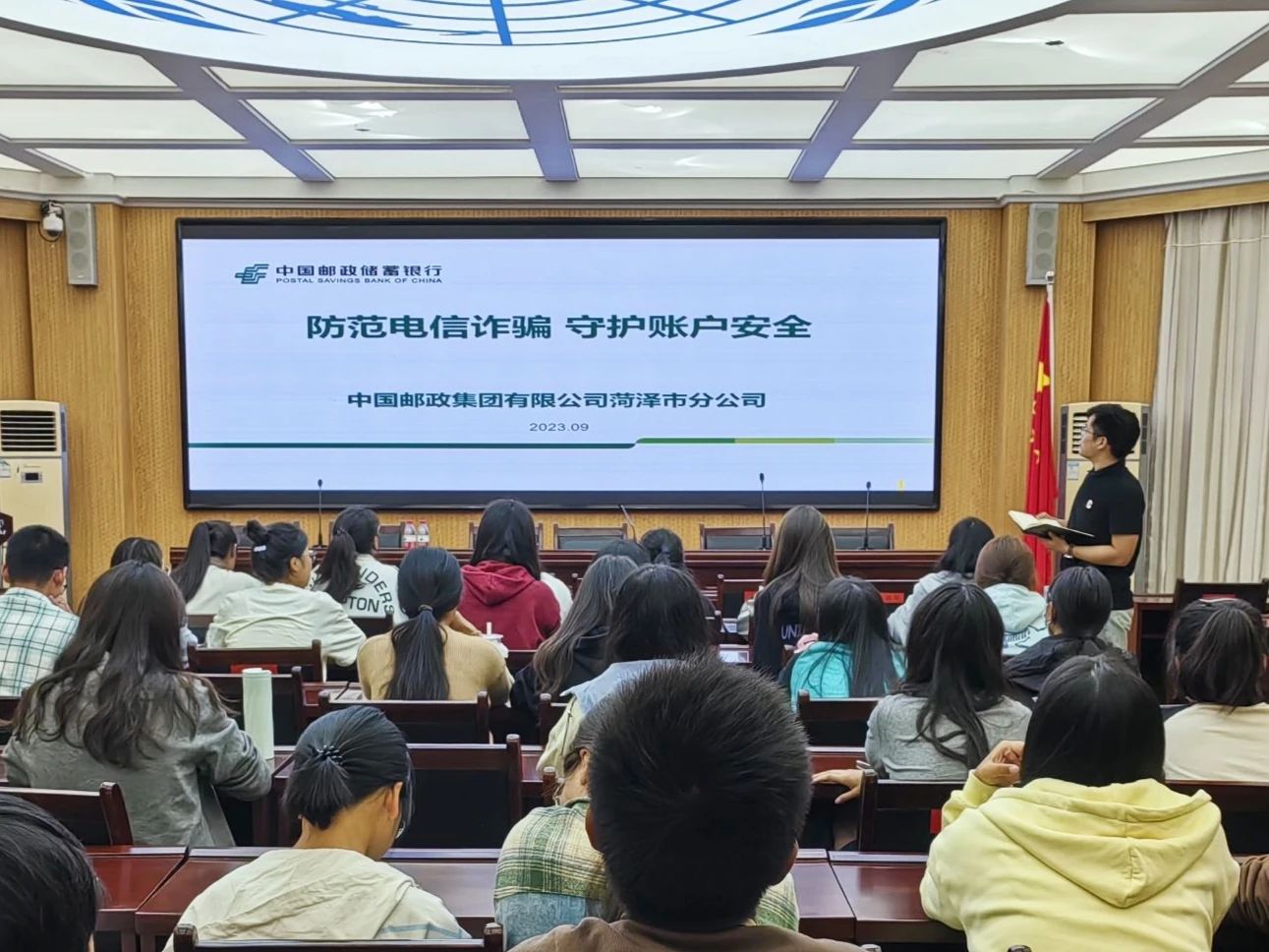 2023年9月27日,伟德国际victor1946邀请中国邮政集团有限公司菏泽市分公司金融部在外语楼102会议室为2023级新生开展《防范电信诈骗,守护账户安全》的讲座。张丽竞副书记、2023级辅导员丁经纬老师及2023级100余位同学参加讲座。