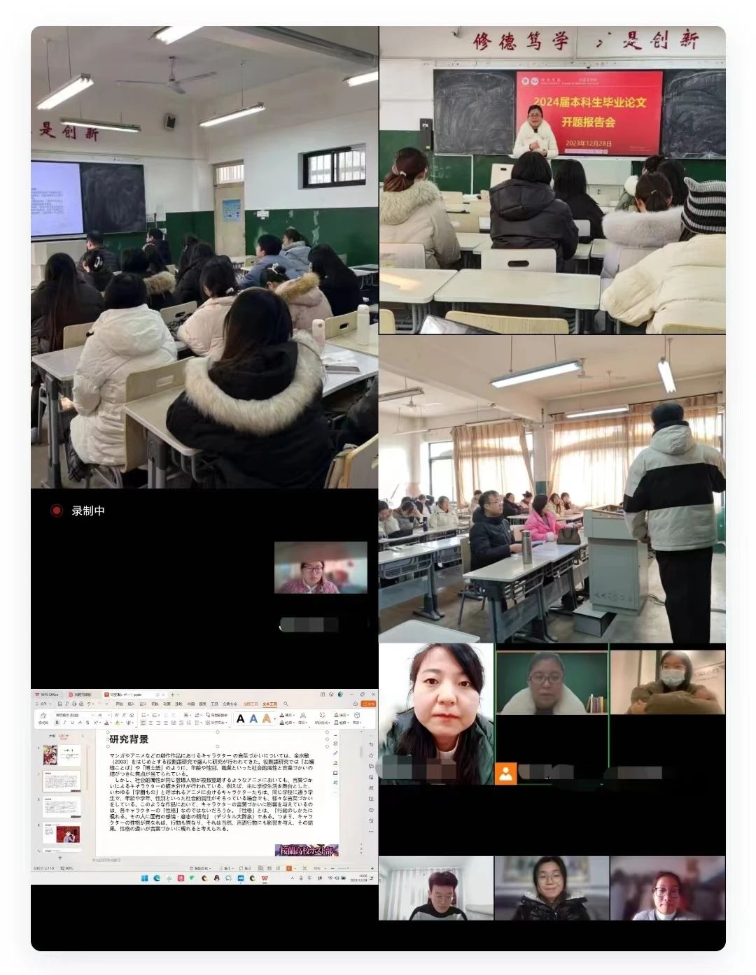 12月28日下午,伟德国际victor1946举办了2024届日语专业毕业论文开题报告会。报告会共有84名日语毕业生和全体日语教师参加,利用线上线下混合式分组进行。楚焕焕老师首先强调了开题报告的重要性及相关注意事项,随后同学们结合PPT讲解,分组依次阐述了论文选题、研究背景、研究思路、研究方法等,答辩教师认真给出了指导意见。