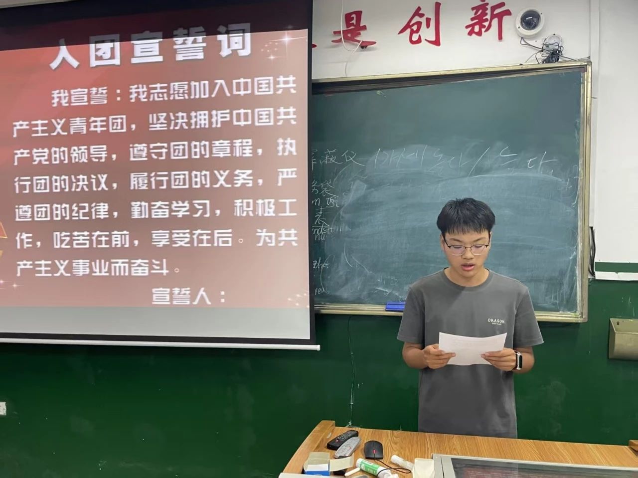 入团仪式在庄严的国歌声中拉开序幕。丁经伟阐述了举行本次入团仪式的意义,并宣布了新团员名单。接下来,新团员颁发了团徽徽章和团员证,学生代表吕畅带领全体新团员进行宣誓,新团员们高举右拳面向团旗庄严宣誓,他们的铮铮誓言表达了对共青团组织的赤诚憧憬与为团组织拼搏奋进的壮志豪情。