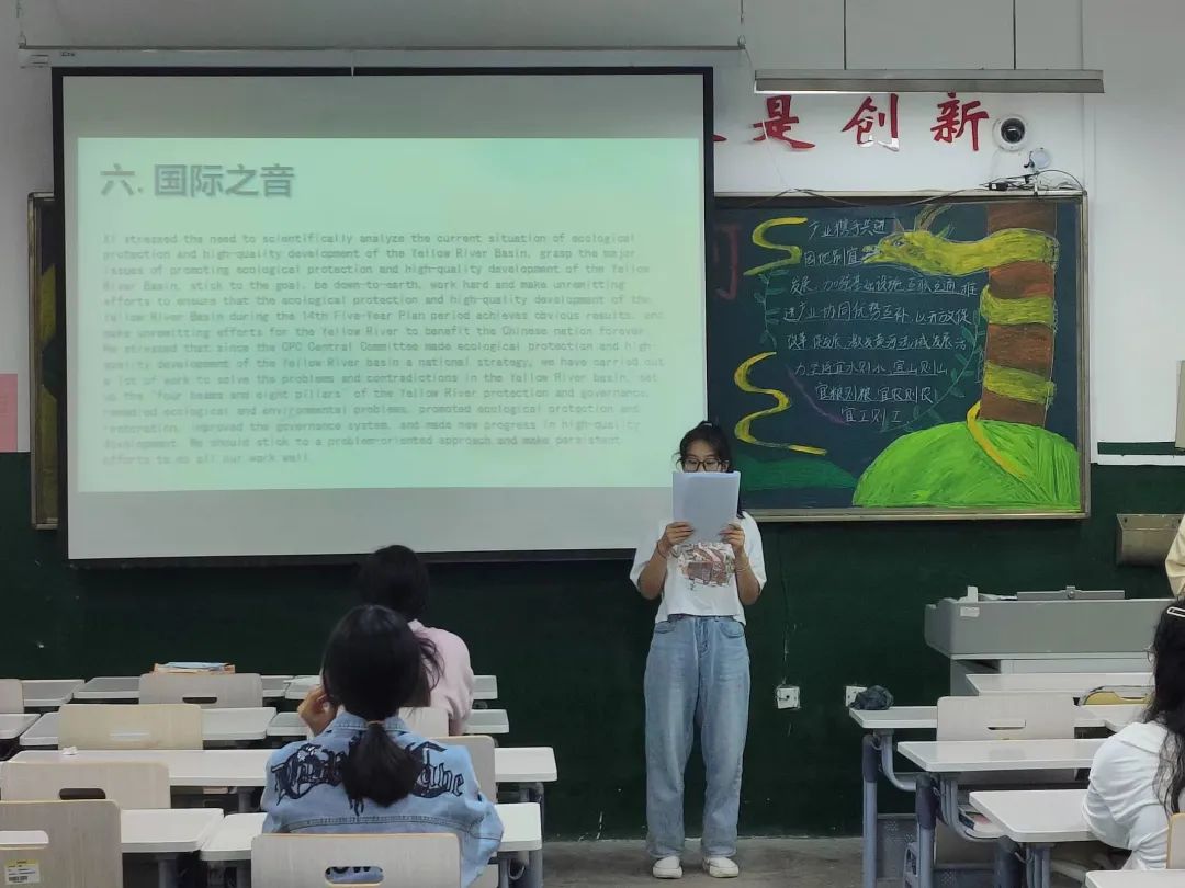 本次论坛内容丰富多彩,图文并茂,并设有集体宣誓、双语演讲、视频欣赏等环节。首先,2022级英语师范二班主持人刘蕾指出,黄河是中华民族的母亲河,孕育了古老而伟大的中华文明,保护黄河是事关中华民族伟大复兴的千秋大计。随后,2022级英语师范二班王伟静在双语演讲环节中提出,黄河流域生态保护至关重要,我们要谨记保护黄河、人人有责的思想观念,共同守护母亲河。最后,主持人呼吁全体学生要强化生态环保意识,宣传生态环保知识,传承和弘扬黄河文化,助力黄河流域生态保护和高质量发展,唱好新时代的“黄河大合唱”。