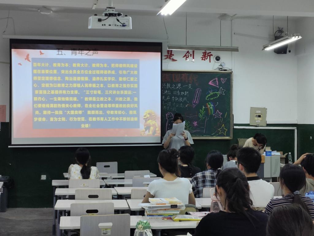 本次论坛内容丰富多彩,图文并茂,并设有集体宣誓、双语演讲、视频欣赏等环节。首先2022级英语师范二班主持人武鹏丽指出,百年大计,教育为本;教育大计,教师为本。教师是立教之本、兴教之源,承担着传播人类思想文化的重任。随后,2022级英语师范二班辛舒会在双语演讲环节中提出,作为当代青年,我们要沐杏雨,念师恩,以“强国有我”的信念,不断提升自己的综合素质,为国家的繁荣发展贡献自己的力量。