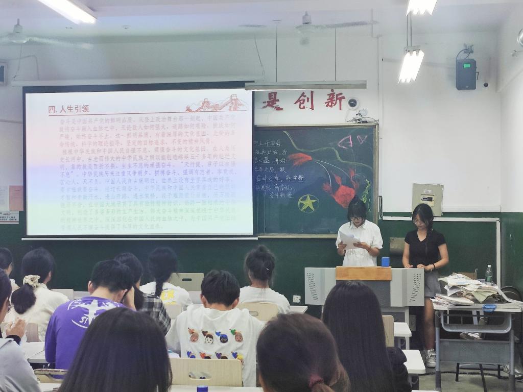 本次论坛内容丰富多彩,图文并茂,并设有集体宣誓、双语演讲、视频欣赏等环节。首先,2022级英语师范二班主持人谷姝晴指出团结奋斗是中国人民创造历史伟业的必由之路,团结才能胜利,奋斗才会成功。随后,2022级英语师范二班丁颖在双语演讲环节中提出,青年应不断提高掌握历史主动的主体意识,增强肯奋斗的内生动力,以自觉主动的姿态承担起自身发展责任、社会责任、国家和民族责任。最后,主持人呼吁全体学生应牢记习近平总书记的殷切嘱托,为实现中华民族的伟大复兴贡献青春力量。
