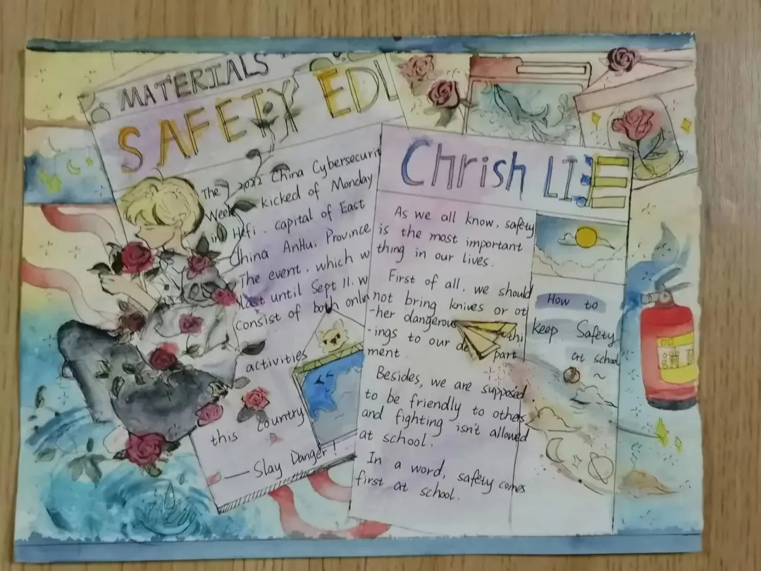 活动前期,参赛学生搜集相关资料,在广泛学习国家安全有关知识的基础上,利用独特的设计及优美的字体,合理巧妙地编排手抄报,诠释了国家安全教育的重要意义。朱安康的作品内容丰富、涉及交通安全、防溺水安全、消防安全、安全常识等,赢得评委的一致好评。李志梅的手抄报花样翻新,凭借新颖别致的画风吸引了评委的目光。