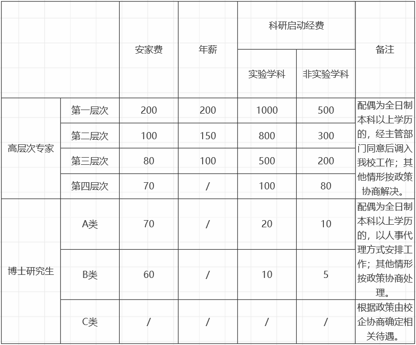 (一)全职引进待遇。安家费于签订学校聘用协议后发放;实行年薪制的根据年薪数额按月发放(单位:万元)。