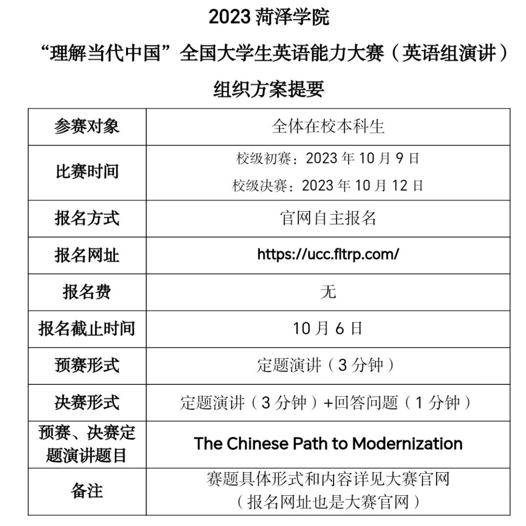 按照大赛组委会要求,本次大赛采用网络报名方式,2023年9月18日起开始报名,拟参赛学生可登录大赛官网(https://ucc.fltrp.com/)从学生报名端口填写个人信息,并上传演讲稿报名参赛。报名截止时间至2023年10月6日。