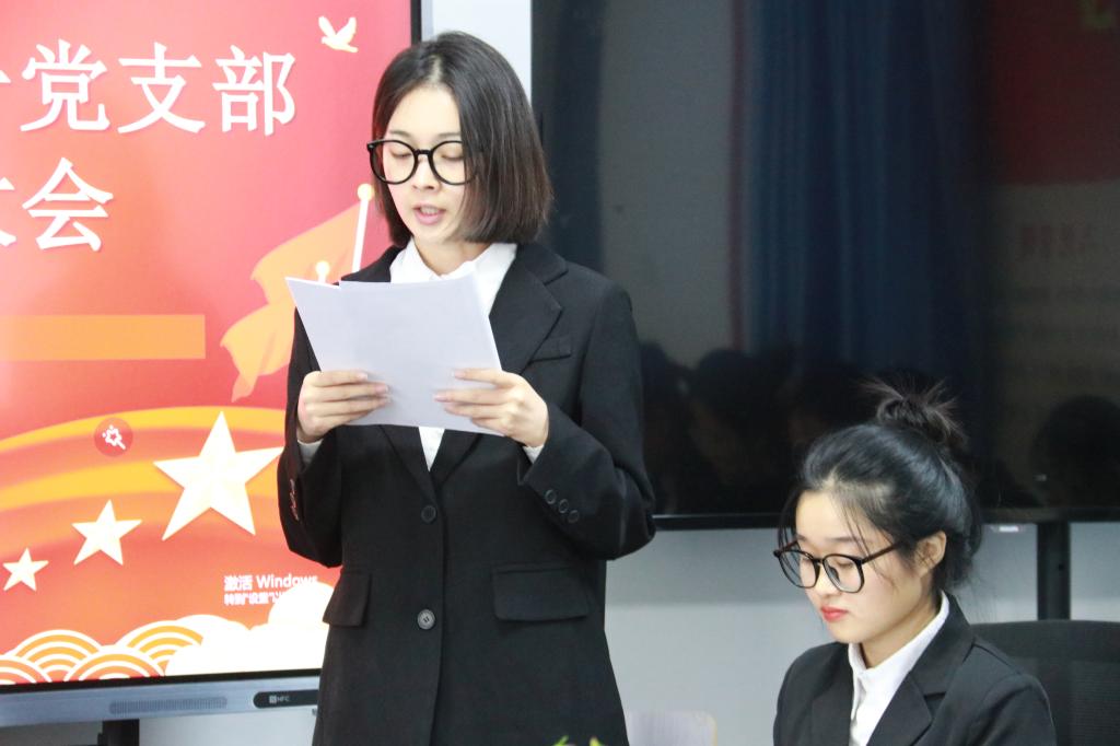 朱欣雨同志代表预备党员进行表态发言,表明作为预备党员将虚心改正不足,以今天为起点,在以后的学习、生活、工作中起到模范带头作用。