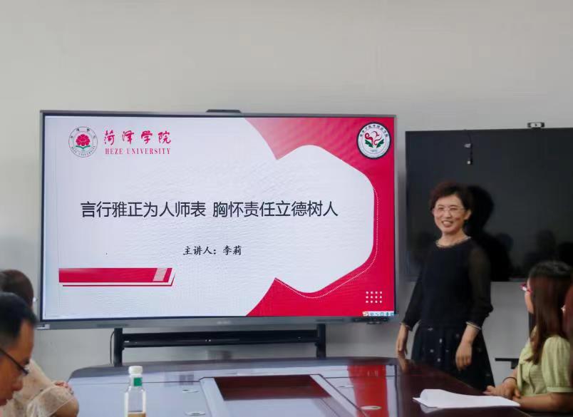 李莉以《言行雅正为人师表 胸怀责任立德树人》为主题,首先以古今经典名家语录为参照梳理了“师德的内涵”,然后从“以政治引领筑牢教师思想之基”、“以形象标准引领教师行为”和“以陶冶情操锤炼个人品格”三个方面深刻阐述了新时代加强师德师风建设的有效路径,最后结合外语学科的特殊性剖析了高校外语专业教师“博学外国语 笃行中国心”的重要性。