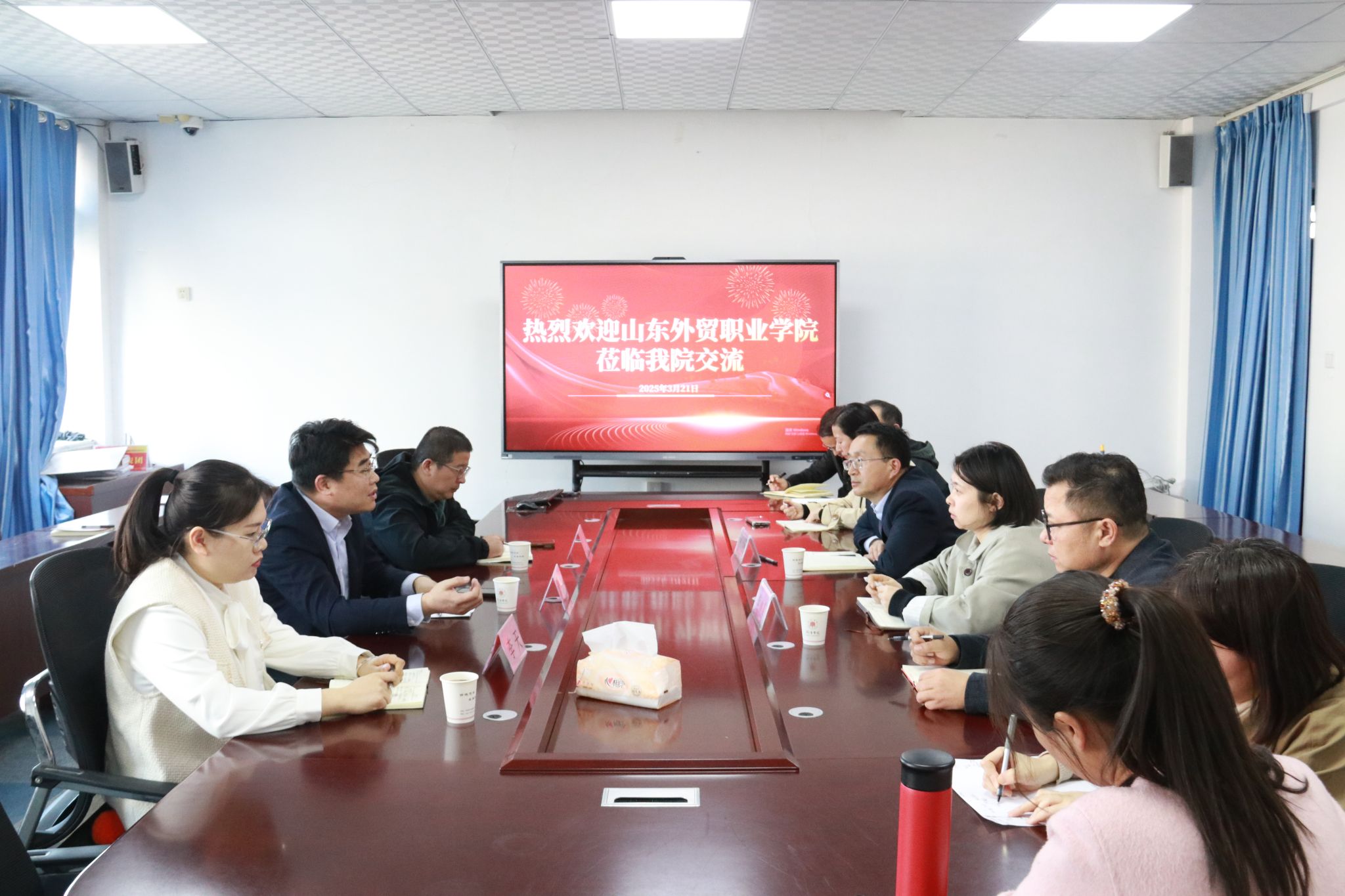 在交流环节,双方就实习实训、就业指导及战略协作等议题展开了深入讨论。山东外贸职业学院分享了在跨境电商人才培养方面的成功经验。经过研讨,双方在共同举办企业孵化培训班、跨境电商师资培训班、开展跨境电商方向课题研究,以及组织学生参加山东省跨境电商实践大赛等方面达成共识。