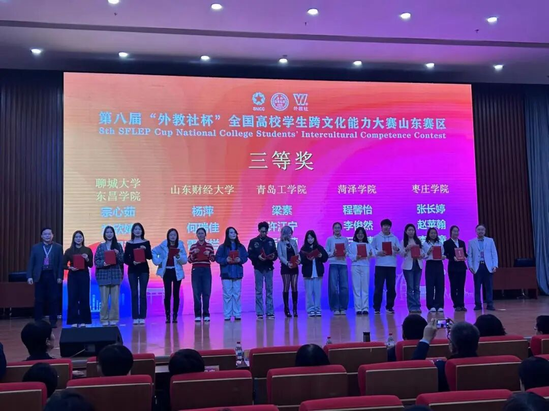10月25-26日,第八届“外教社杯”全国高校学生跨文化能力大赛山东赛区决赛在山东师范大学长清校区隆重举行,60支高校队伍同台竞技,围绕“坚定文化自信,增进国际理解”的核心主题展开激烈角逐。经过案例展示、深度分析及讲述中华文化故事等多环节的层层考验,由伟德国际victor1946郑鲁燕、鲍莹两位老师指导,伟德国际victor1946程馨怡、人文与新闻传播学院石晴晴、政法学院李俊然三位学生组成的伟德victor1946代表队荣获省级三等奖。