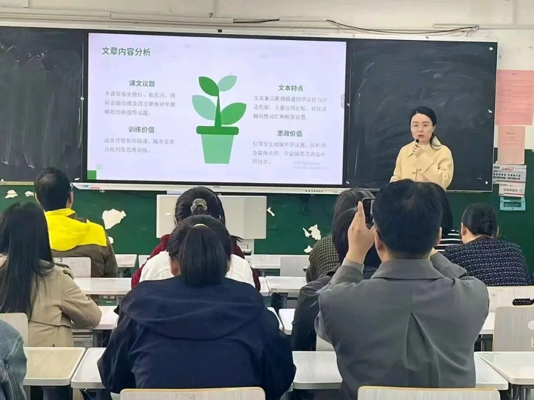 活动开始,备课主讲教师孙梦阳围绕《英语报刊阅读》课程China Watch单元中“With New Bank, China Shows U.S. It’s Got Soft Power”章节进行了说课汇报。 汇报立足亚投行、软实力、国际金融治理以及西方媒体涉华报道等内容,系统介绍了章节内容、学情分析、教学目标与重难点、课程思政主线设计、教学过程与思政融入、评价方式与育人成效等。主讲教师重点展示了如何以新闻阅读能力培养为基础,以媒体政治倾向性分析为抓手,以课程思政为提升,推动知识传授、能力培养与价值引领相统一。在教学设计中,课程思政贯穿导入、精读、讨论、写作和反思全过程,引导学生从“读新闻”走向“辨立场”“树自信”“会表达”。