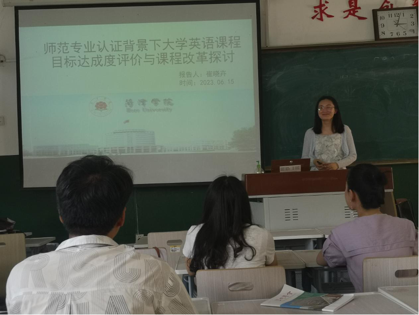伟德国际victor1946于6月15日下午3点至4点在外语楼112成功举办了第二十三期的“青蓝沙龙”活动。本次讲座由崔晓卉老师主讲,主题为“师范专业认证背景下大学英语课程目标达成度评价与课程改革探讨”。伟德国际victor1946部分教师参加。