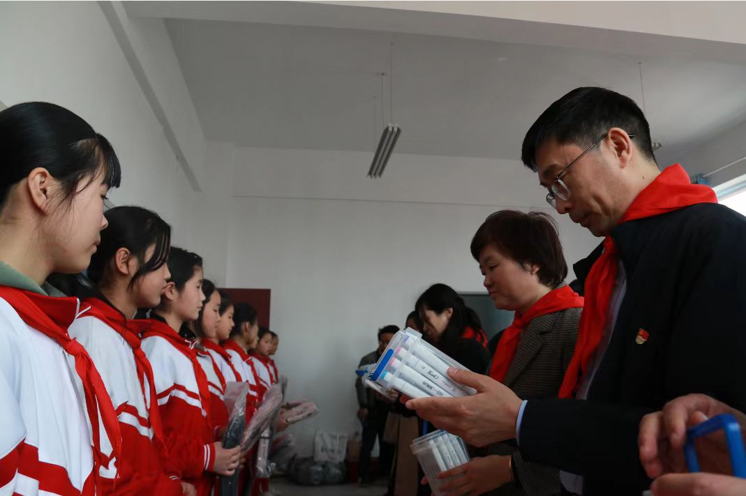 仪式伊始,石校长代表学校全体教师对我院教师表示了热烈的欢迎。少先队员为每位老师佩戴红领巾,并致以少先队最崇高的敬礼。我院为孩子们捐赠了书包、篮球等文体用品。